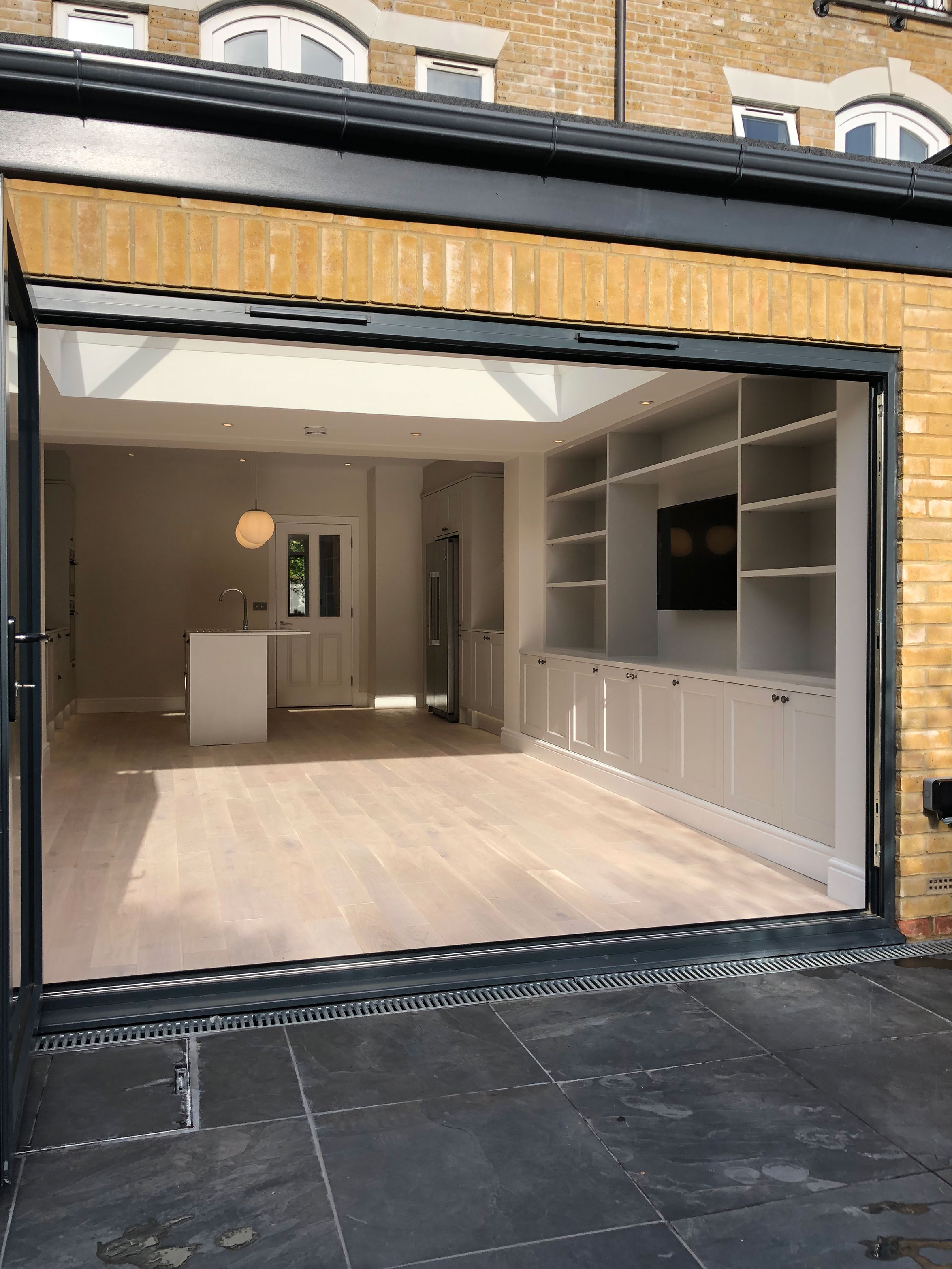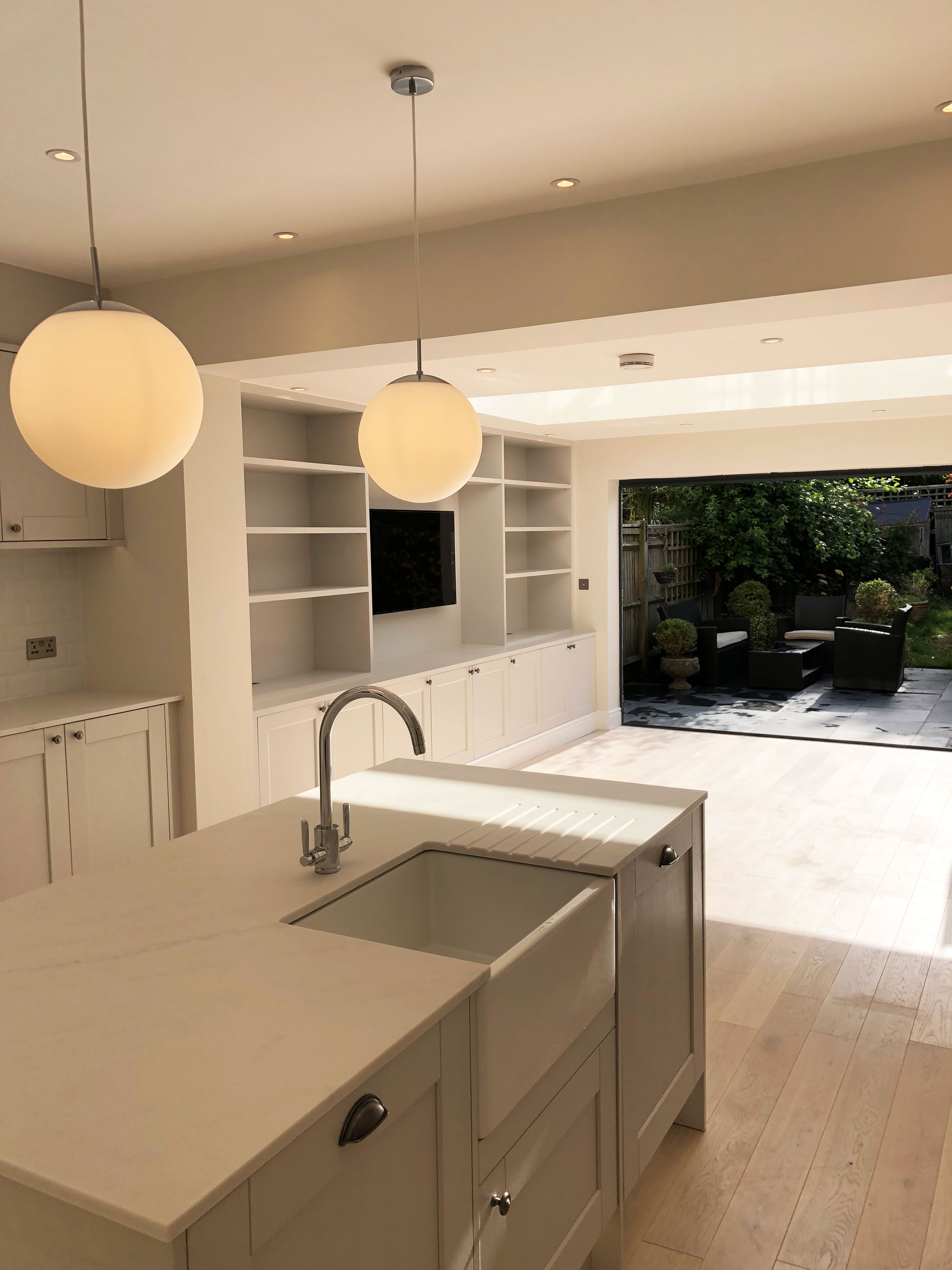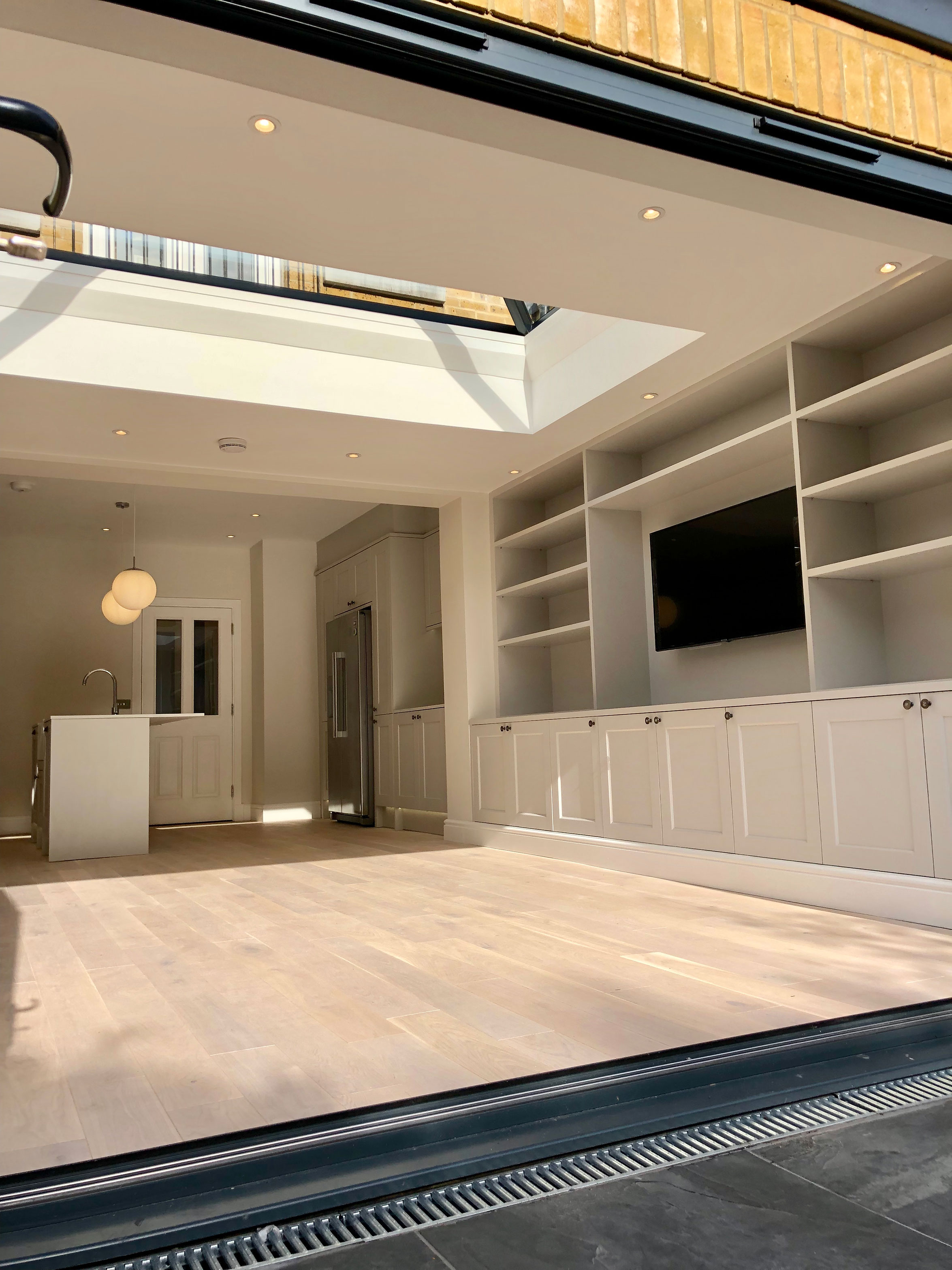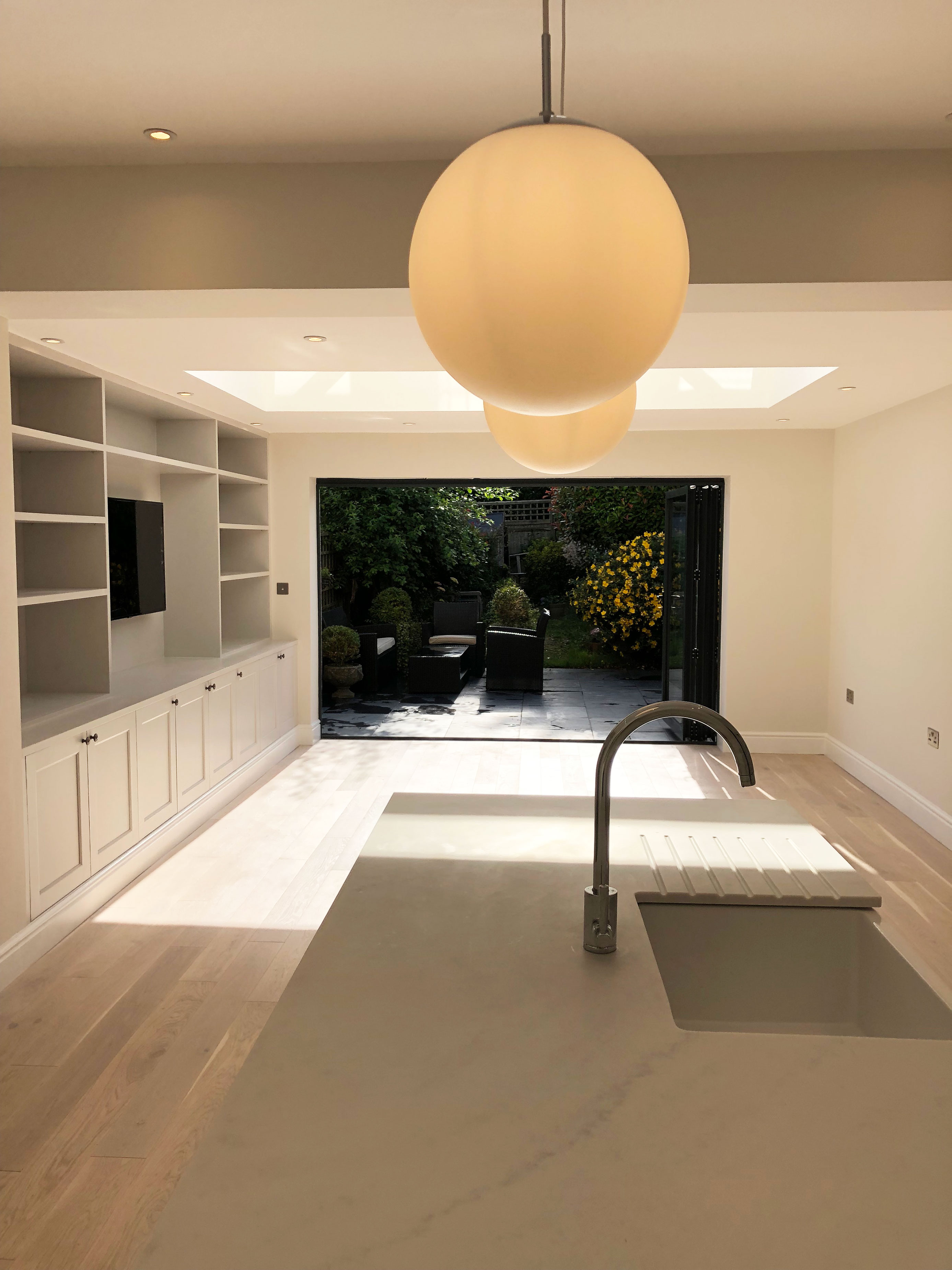 We undertook the renovation of a kitchen extension in this London Townhouse in Beckenham. This kitchen extnesion transformed the existing kitchen into a large and light kitchen/ living area with beautiful bifold doors and pyramid skylight. The size gained from the extension allowed the client to move her living area from upstairs into this room. The centre piece of the extension is most certainly the beautiful bespoke tv unit we made for the client. Which not only looks beautiful but creates fantastic storage. Our services for this project included build and total project management from beginning to completion.