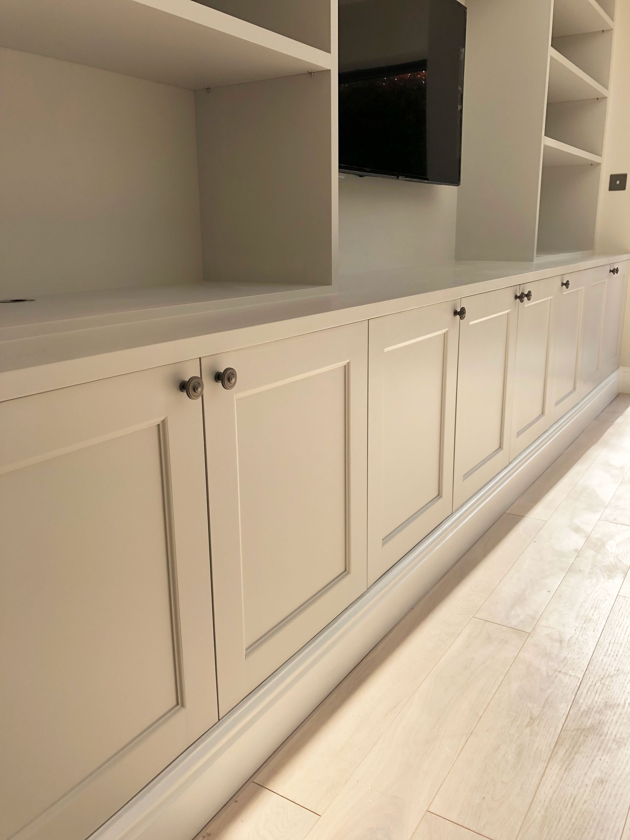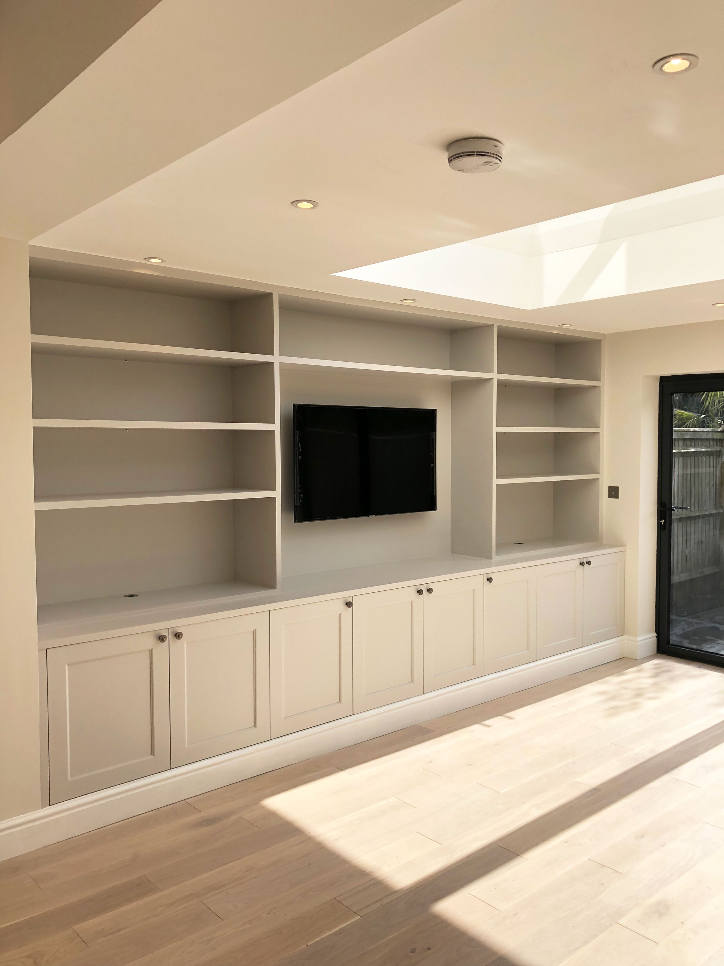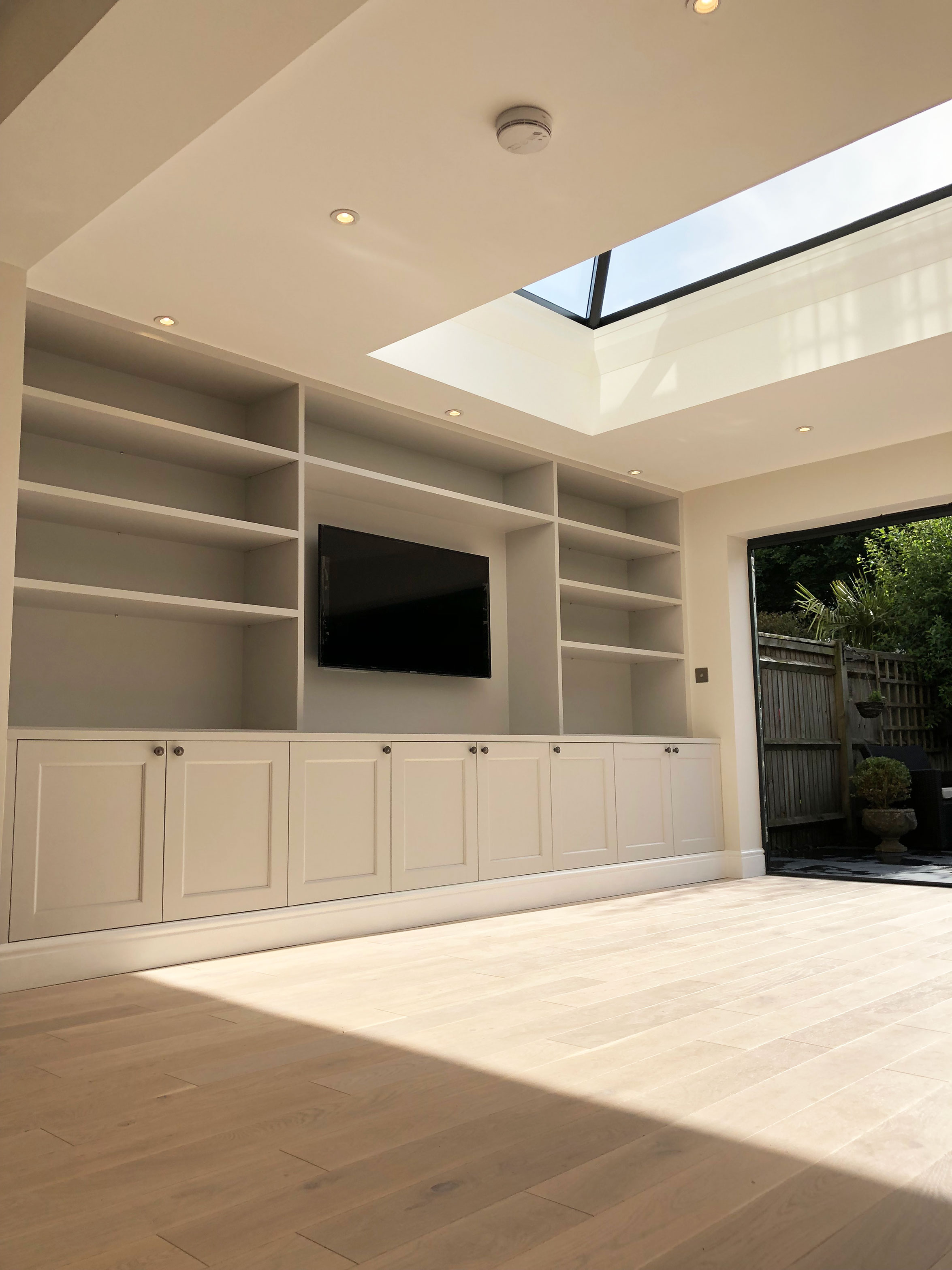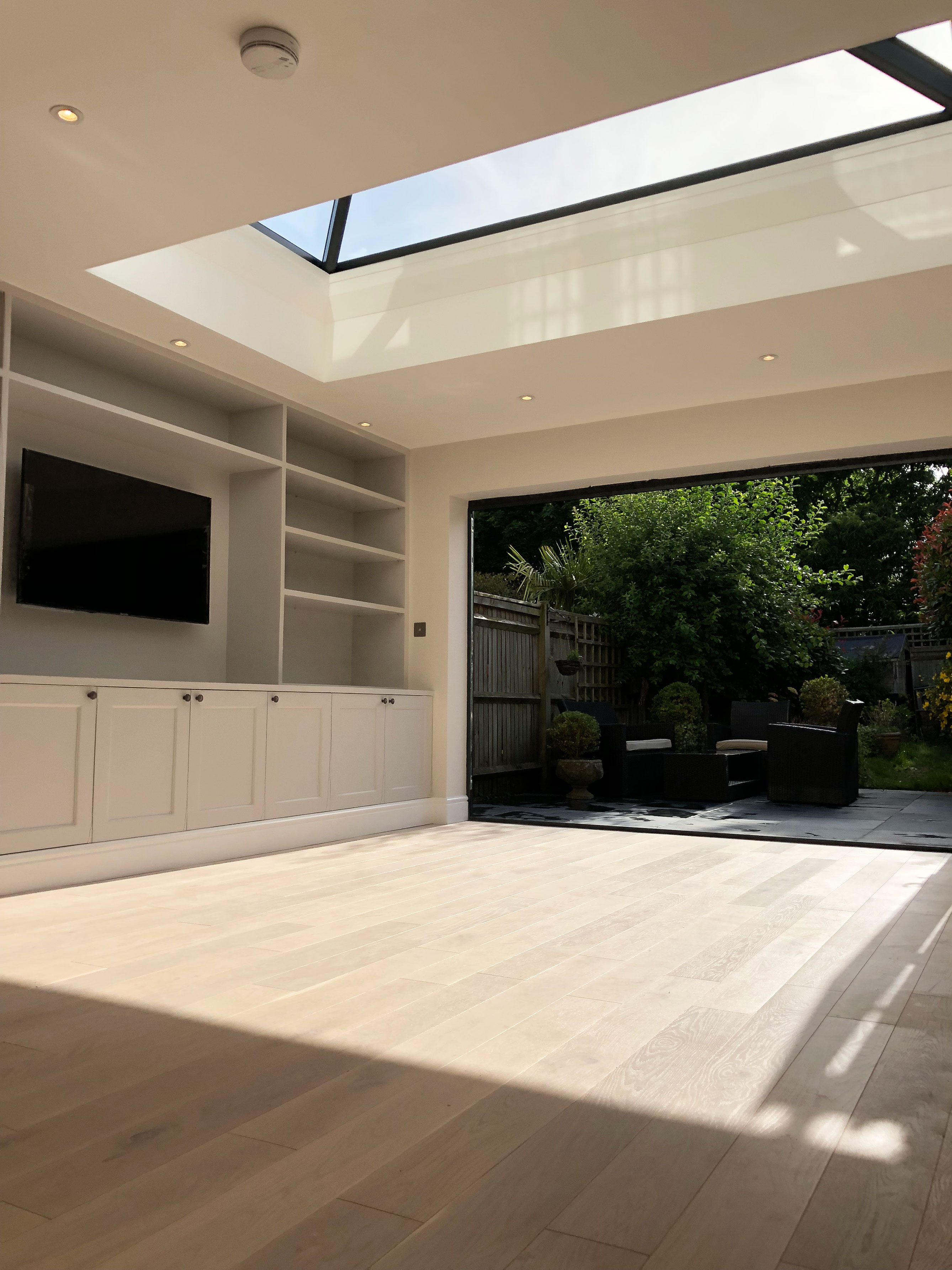 We undertook the renovation of a kitchen extension in this London Townhouse in Beckenham. This kitchen extnesion transformed the existing kitchen into a large and light kitchen/ living area with beautiful bifold doors and pyramid skylight. The size gained from the extension allowed the client to move her living area from upstairs into this room. The centre piece of the extension is most certainly the beautiful bespoke tv unit we made for the client. Which not only looks beautiful but creates fantastic storage. Our services for this project included build and total project management from beginning to completion.