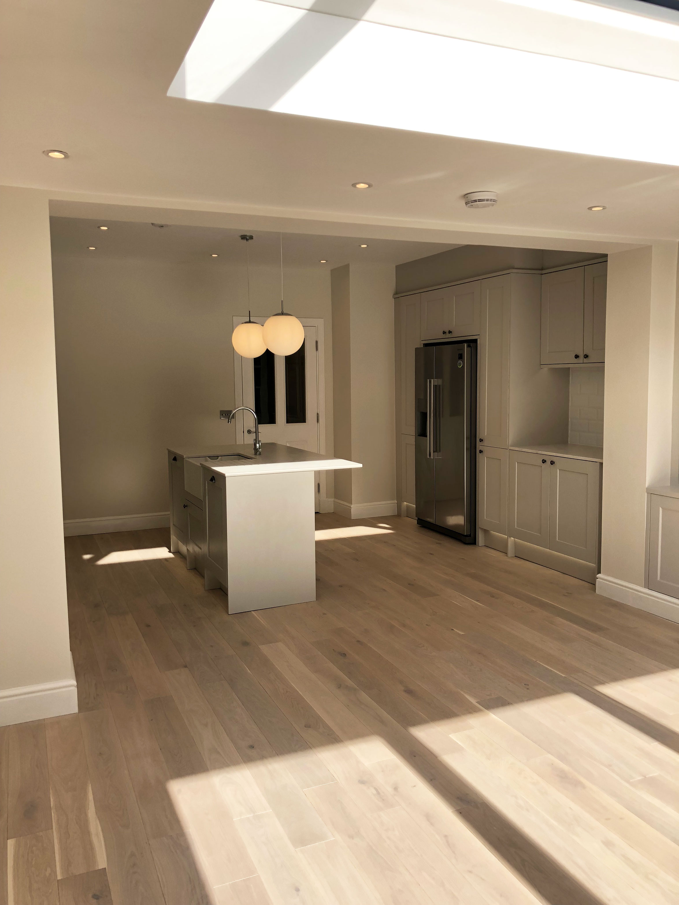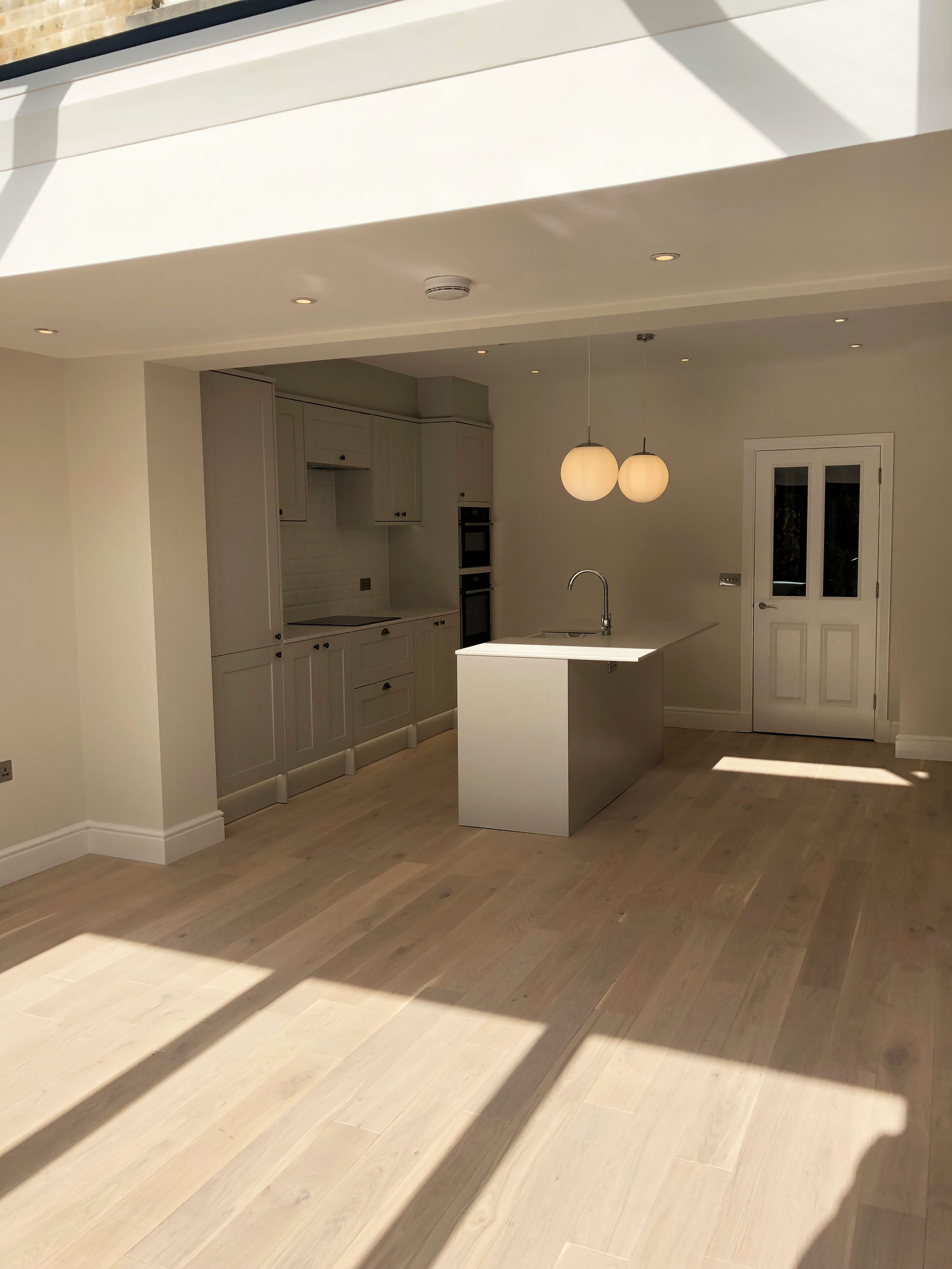 A Short Summary of work includes Structural Adjustments with kitchen extension, Skylight and bifold glazing, bespoke new kitchen design & fitted with central island, bespoke tv unit. Wet Underfloor Heating, full rewire & lighting design scheme created, full re plumb, decorating, landscaped garden with lighting design.